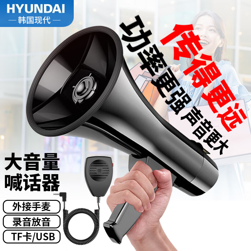 HYUNDAI现代 MK-08 大功率喇叭户外手持扩音器扬声器 录音可插U盘防雨防汛大喇叭喊话器 摆摊宣传叫卖喇叭价格:199.00元!