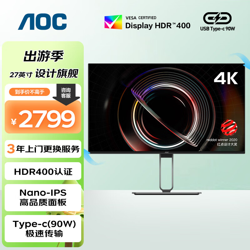 AOC电脑显示器 27英寸4K高清 90W type-c NanoIPS硬屏 HDR400 专业设计办公旋转升降支架U27U2S价格:2799.00元!
