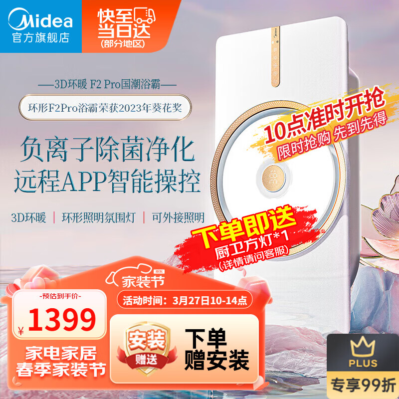 美的(Midea)风暖浴霸暖风照明排气一体集成吊顶卫生间吹风环形双核智能F2Pro价格:1499.00元!