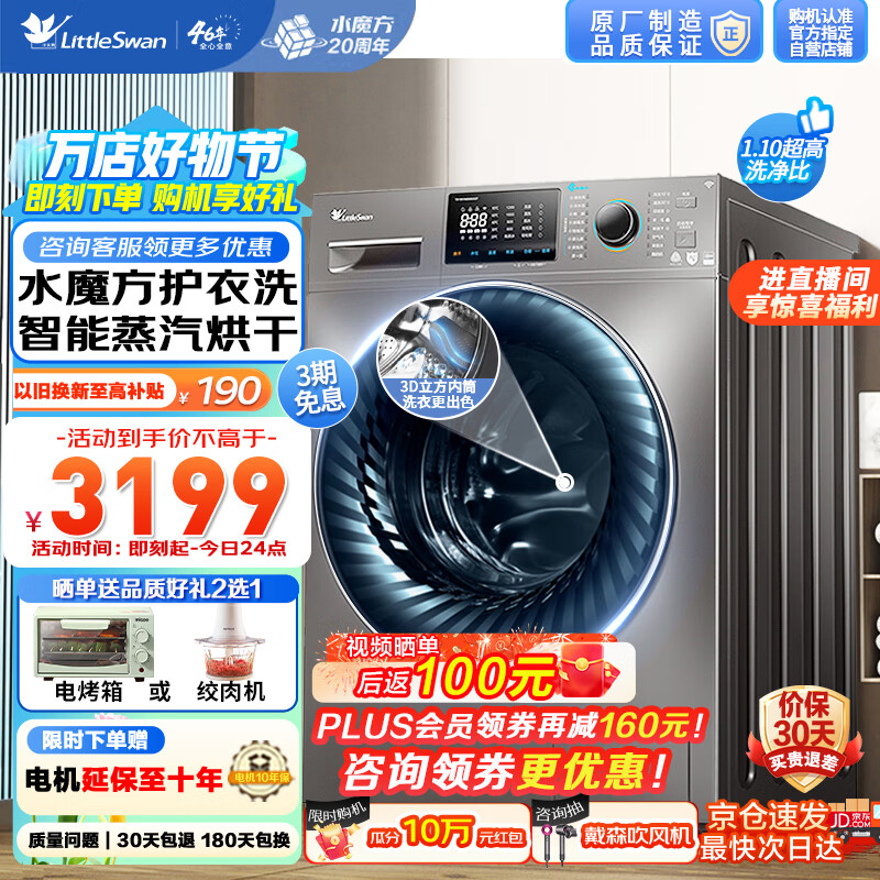 小天鹅(LittleSwan)洗衣机全自动10公斤滚筒洗烘一体水魔方洗衣机 除菌一级能效 以旧换新TD100V868WMADT价格:3099.00元!