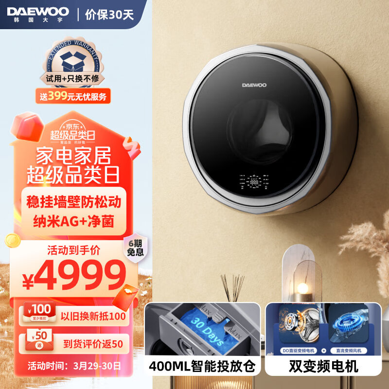 大宇(DAEWOO)3公斤壁挂洗衣机洗烘一体滚筒洗衣机全自动内衣洗 dd直驱变频 智能投放 DY-BGX06Hpro 极光银价格:4999.00元!