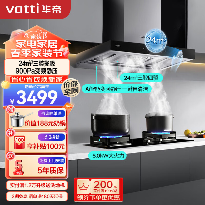 华帝(VATTI)抽油烟机家用顶侧欧式变频大吸力烟机燃气灶烟灶套装24风量自动清洗吸油烟机灶具套装i11206天然气价格:3499.00元!