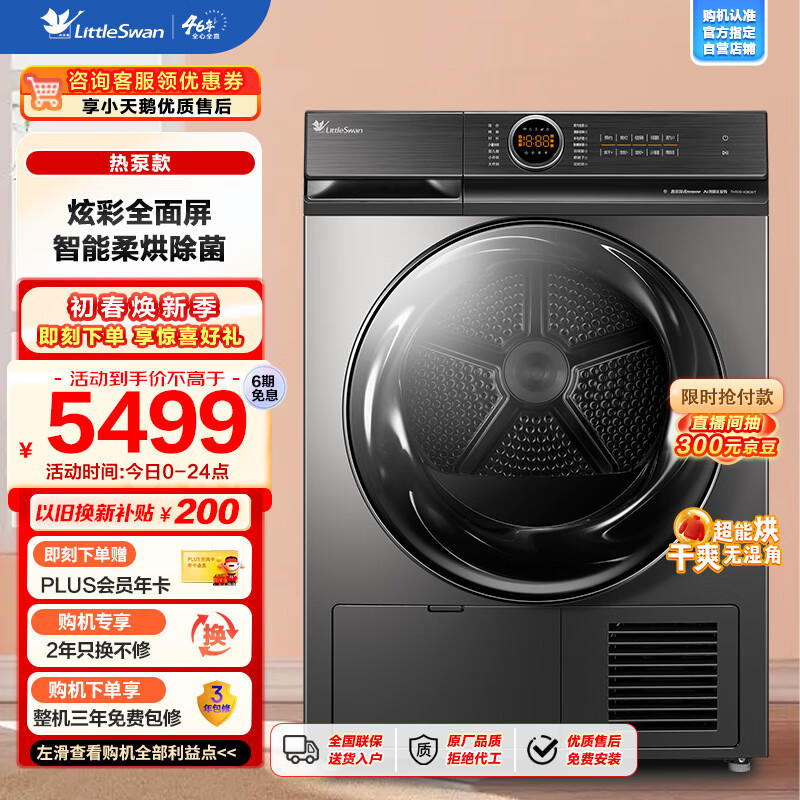 小天鹅(LittleSwan)烘干机 热泵式家用干衣机 杀菌除螨 蒸汽免熨 晒被子程序 10公斤 智能家电 TH100-H36WT价格:5699.00元!