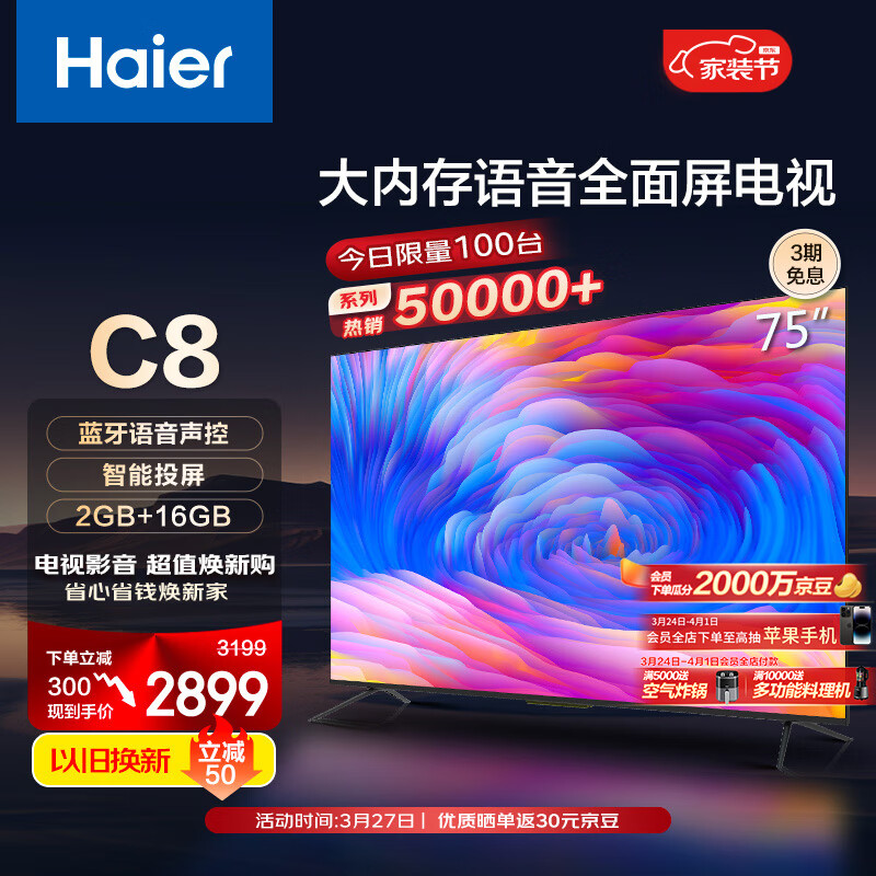 海尔(Haier)LU75C8 75英寸4K屏幕智能音画质客厅平板液晶电视机家用彩电AI远场语音2+16G以旧换新85价格:3199.00元!