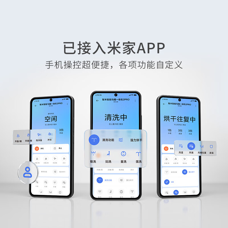 功能:暖风烘干,自动除臭,按摩清洗,臀部清洁,座圈加热,喷嘴自洁,女性清洗,喷嘴移动清洗,记忆功能,净化水质,水温调节,水压调节,风温调节,坐温调节,柔和夜灯