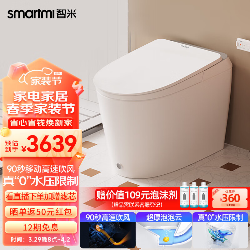 智米智能马桶泡沫盾无水压自动冲水智能坐便器2PRO ZNMTY08ZM-400坑距价格:3999.00元!