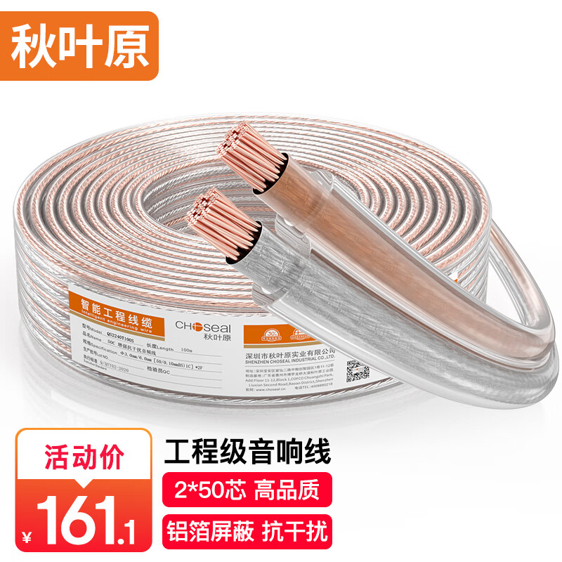 秋叶原(CHOSEAL)音频线 音响线 音箱线 喇叭线 发烧级 增强型屏蔽抗干扰 纯铜50芯 100米 QS2240T100S价格:179.00元!