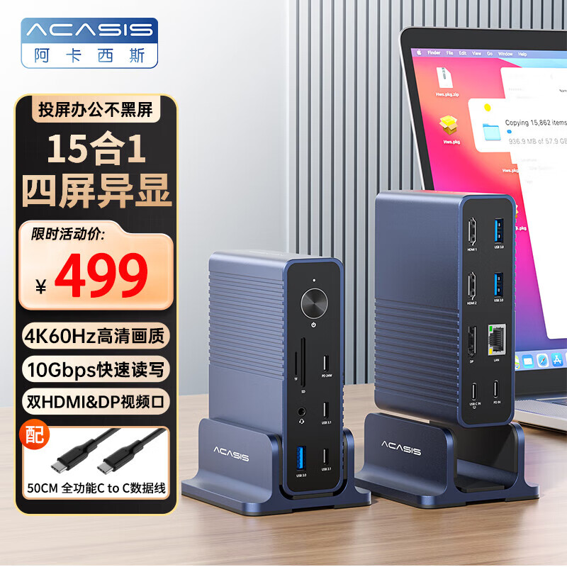 阿卡西斯桌面拓展坞Type-C扩展坞dp转雷电4拓展坞60Hz四屏异显HDMI网线转换器立式苹果Mac笔记本DS-7A15价格:554.45元!