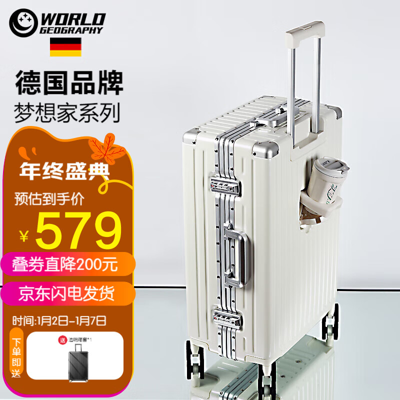 地理德国行李箱男女24英寸铝框旅行箱杯架拉杆箱万向轮密码箱 象牙白价格:779.00元!