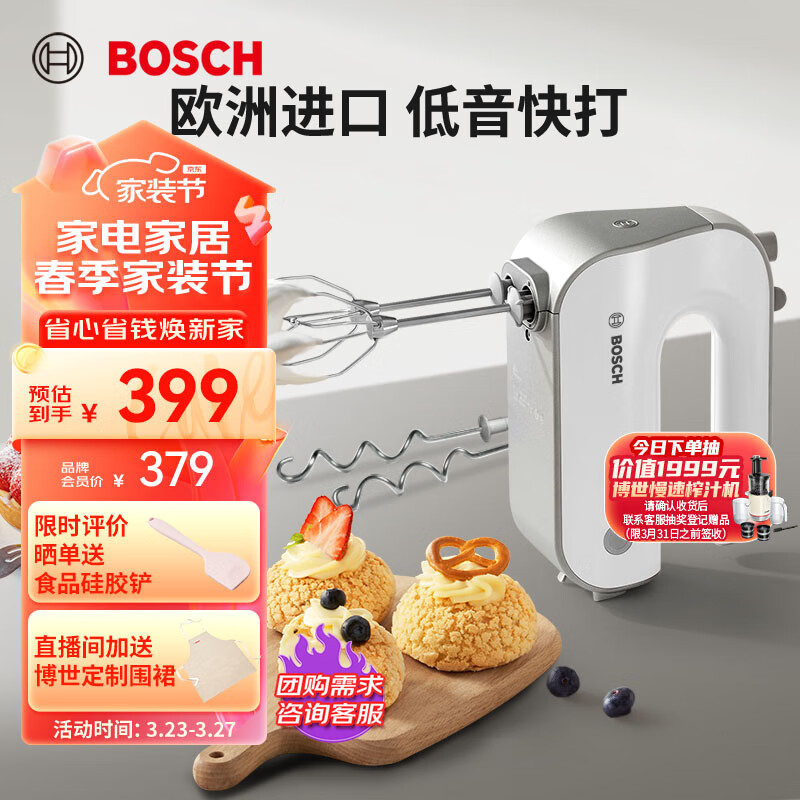 博世(BOSCH)轻音防溅电动打蛋器家用小型烘焙大功率打蛋机搅拌机MFQM440WCN价格:399.00元!