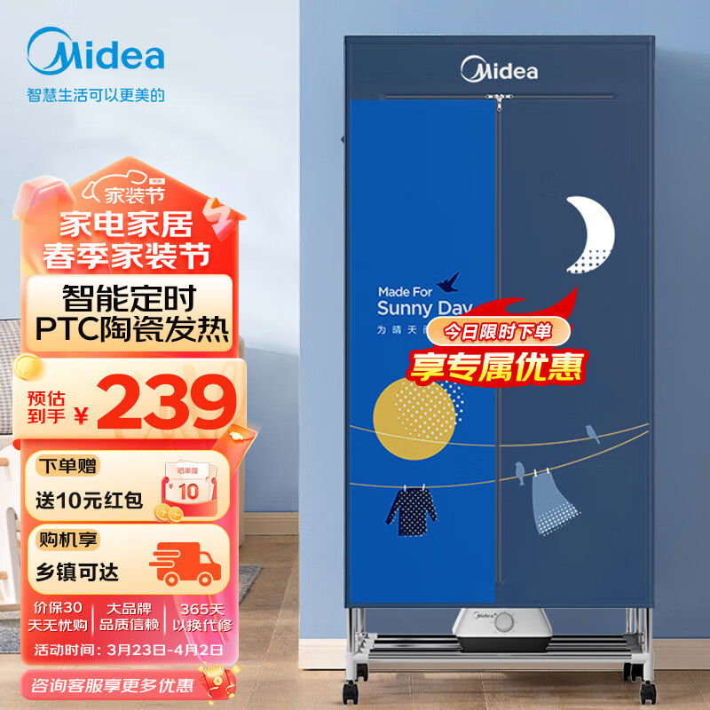 美的(Midea)烘干机家用 衣服干衣机婴儿衣物烘干机430L大容量风干机定时烘干衣柜小型衣物护理柜万向轮JQ3价格:239.00元!