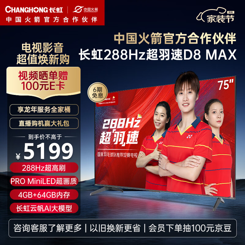 长虹电视75D8 MAX 75英寸288HzMiniLED游戏电视 MEMC 4+64GB 4K超高清智能平板液晶LED电视机 以旧换新价格:5199.00元!