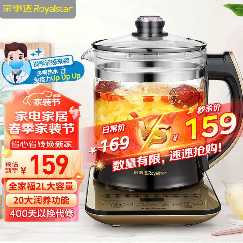 荣事达(Royalstar)养生壶煮茶器煮茶壶多功能电水壶烧水壶电热水壶茶壶玻璃水壶配滤网2L YSH20K价格:159.00元!