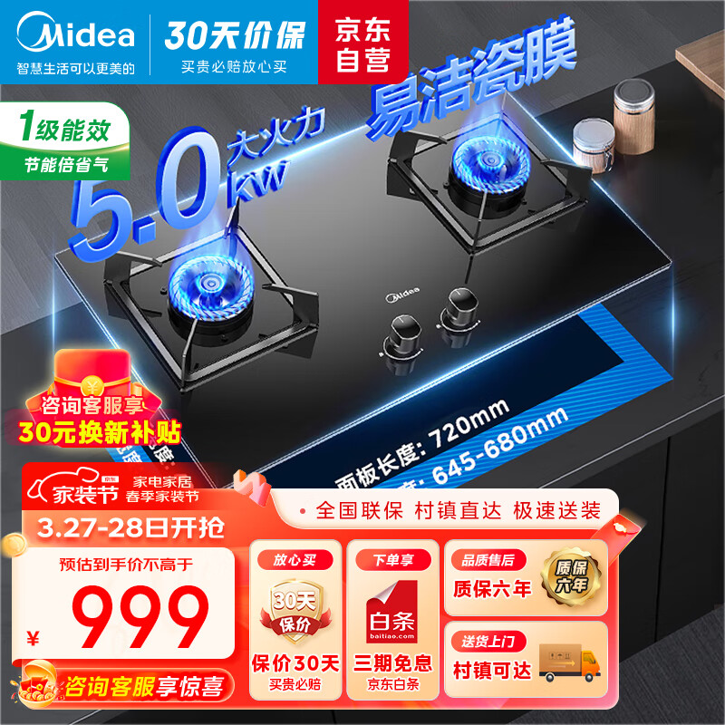 美的(Midea)燃气灶双灶家用5.0KW大火力黑晶宽面板台嵌两用双灶液化气灶Q330价格:999.00元!