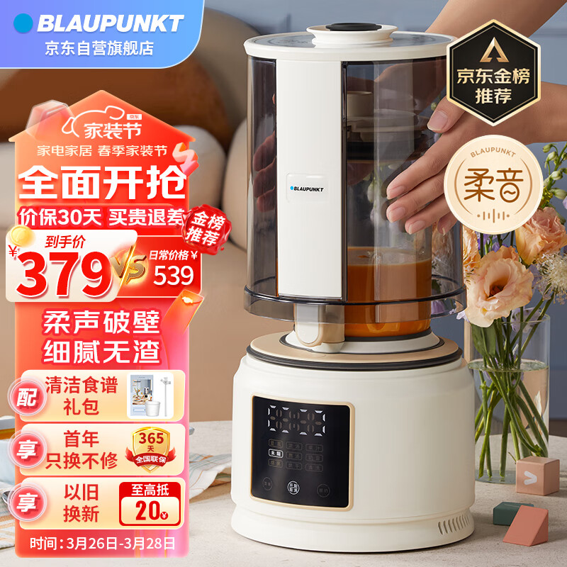 蓝宝(BLAUPUNKT)柔音破壁机家用豆浆机加热全自动智能预约榨汁机辅食机料理机早餐机1.5L大容量PB02白色价格:379.00元!