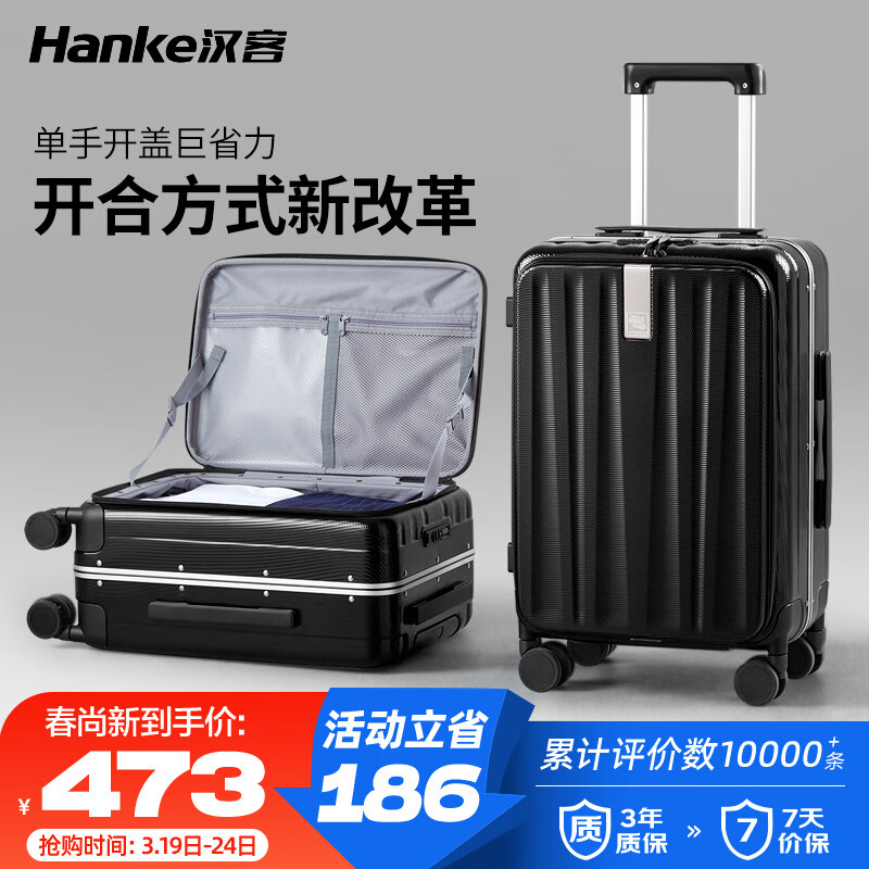 汉客行李箱男拉杆箱女旅行箱69升大容量24英寸墨玉黑镇店前侧开盖铝框价格:659.00元!