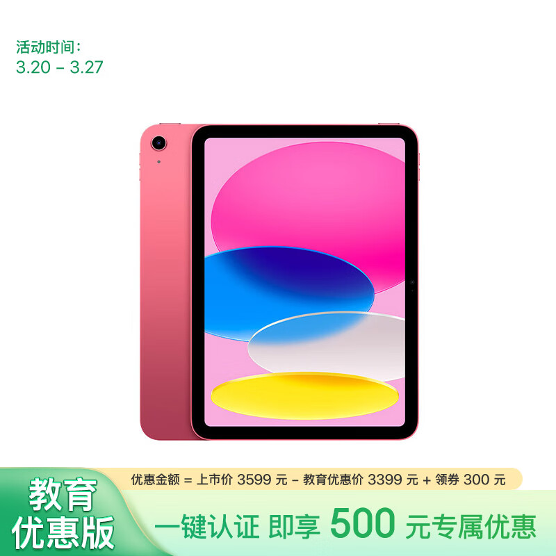 Apple/苹果【教育优惠】iPad 10.9英寸 2022款(64GB WLAN版/A14芯片/学习办公娱乐/MPQ33CH/A)粉色价格:3399.00元!