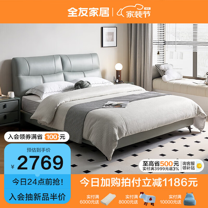 全友家居 真皮艺床现代轻奢主卧室头层牛皮双人大床1.8x2米家具105201价格:3955.71元!