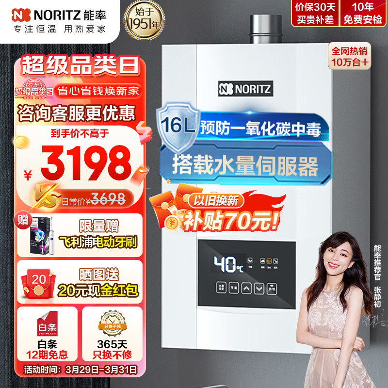 能率(NORITZ)16升燃气热水器天然气 全屋恒温 智控水伺服 下置风机 综合降噪 以旧换新GQ-16E4AFEX(JSQ31-E4)价格:3198.00元!