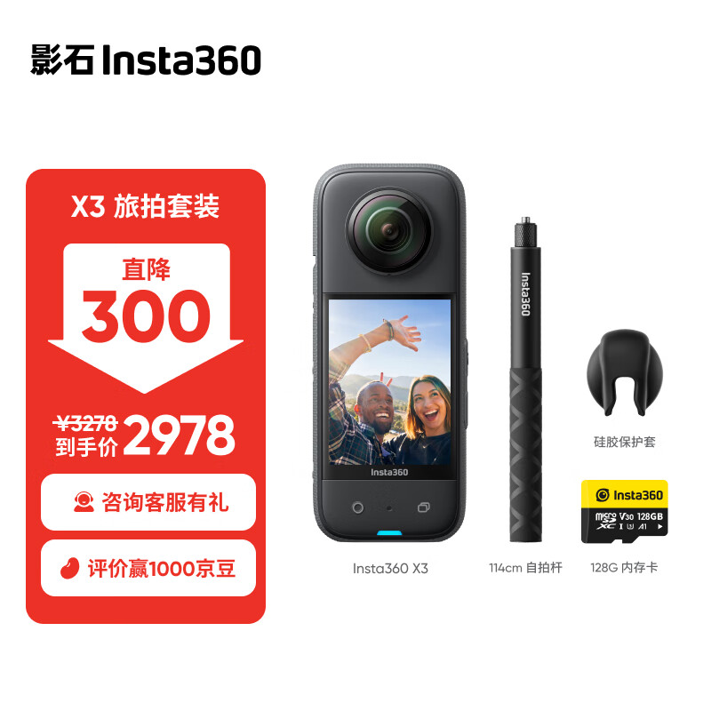 Insta360影石 X3全景运动相机防抖相机5.7K高清360全景摄像机摩托车vlog滑雪(旅拍套装)价格:2978.00元!