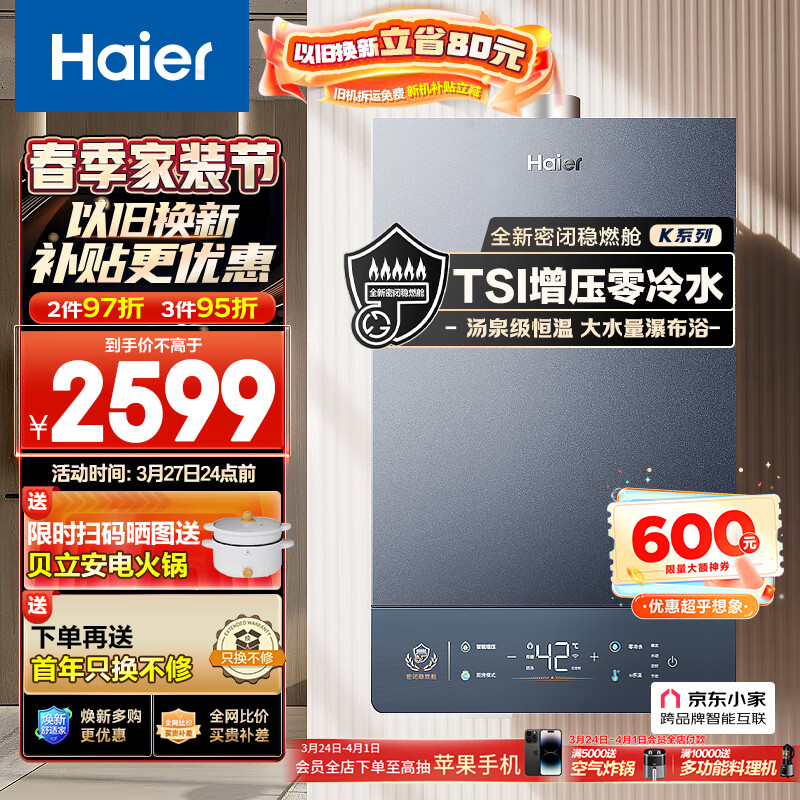 海尔(Haier)16升【K系列KT5】燃气热水器天然气 TSI增压零冷水 水伺服恒温五段微火一级静音JSQ31-16KT5FPRCU1价格:3199.00元!
