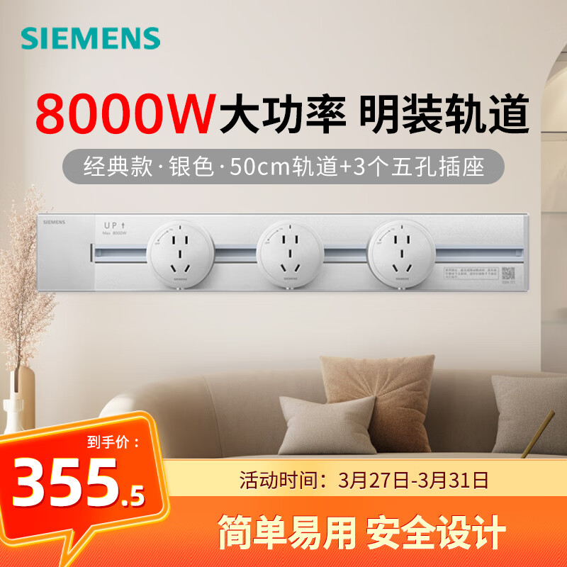 西门子(SIEMENS)8000W经典款轨道插座套装 可移动墙壁插座 明装大功率新国标 50cm轨道+3个五孔圆形插座 银色价格:474.00元!