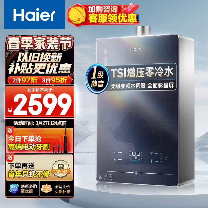 海尔(Haier)16升燃气热水器天然气 TSI增压零冷水 无级变频水伺服 一级静音 彩晶屏 JSQ30-16QR5DPQGU1价格:2799.00元!