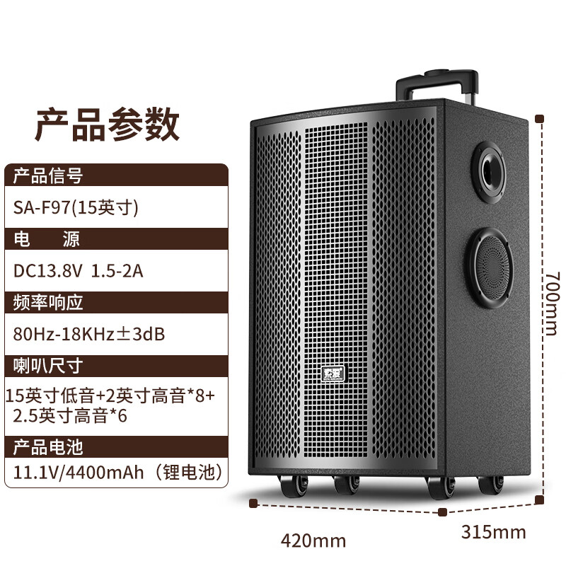 索爱(soaiy)F97升级4个轮大功率15喇叭重低音广场舞音响移动家用户外K歌蓝牙拉杆便携式音箱带无线话筒15英寸价格:2980.00元!