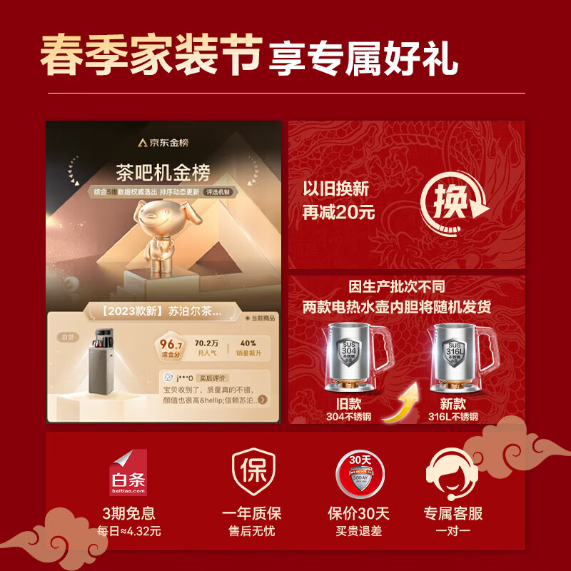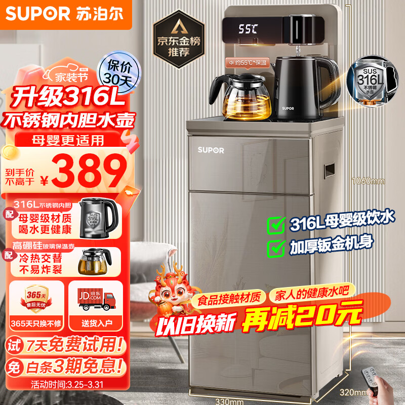 苏泊尔(SUPOR)茶吧机 家用高端饮水机 遥控智能下置水桶 全自动自主控温立式316L水壶泡茶机 CBJ33【温热款】价格:389.00元!
