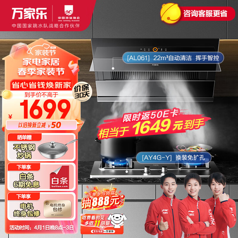 万家乐抽油烟机 烟灶套装 22立方侧吸式大吸力挥手自清洗不锈钢免扩孔燃气灶具套装AL061+AY4G液化气价格:1899.00元!