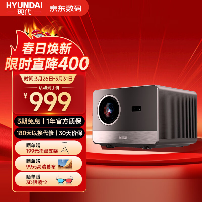 HYUNDAI现代H1 投影仪家用 投影机办公家庭影院(1080P高清 无感自动对焦 自动梯形校正 手机无线投屏)价格:1399.00元!