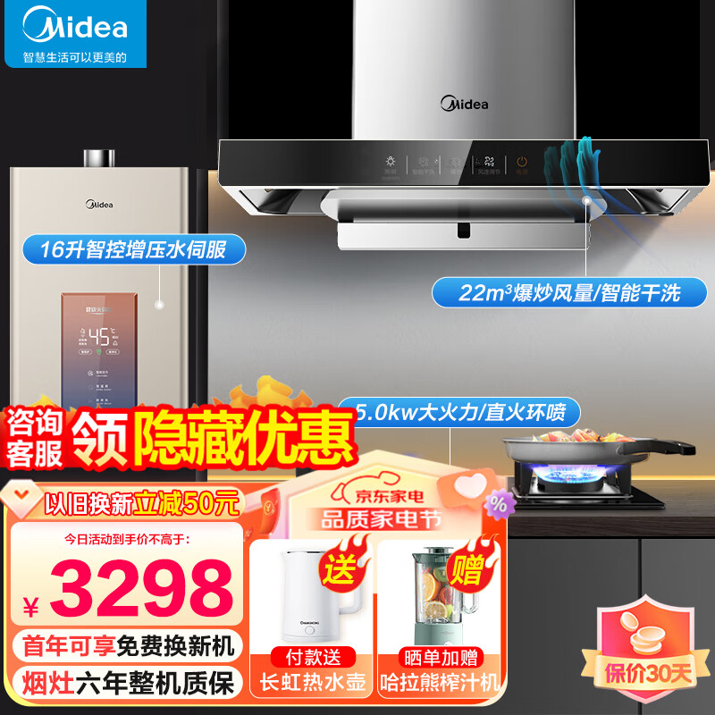 美的(Midea)欧式顶吸抽油烟机家用22立方大吸力油烟机燃气灶具热水器厨房电器三件套装天然气TN306+330+MK3价格:3298.00元!