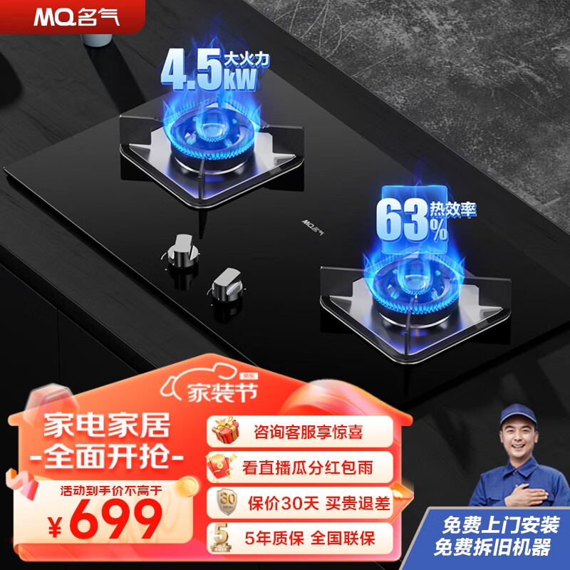 名气(MQ)老板燃气灶家用煤气灶双灶全进风大火力台嵌两用4.5KW瞬时点火大火力灶具液化气B305A价格:699.00元!