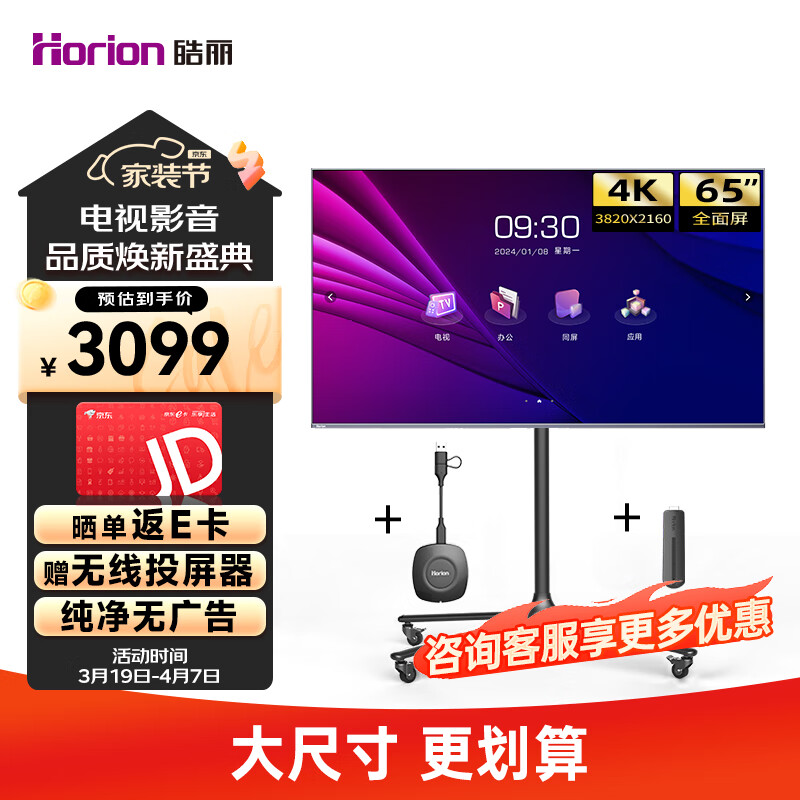 皓丽(Horion)65英寸会议平板电视一体机智慧屏投屏投影电视一体机商用显示会议室教学培训大屏65H5桌面底座价格:3099.00元!