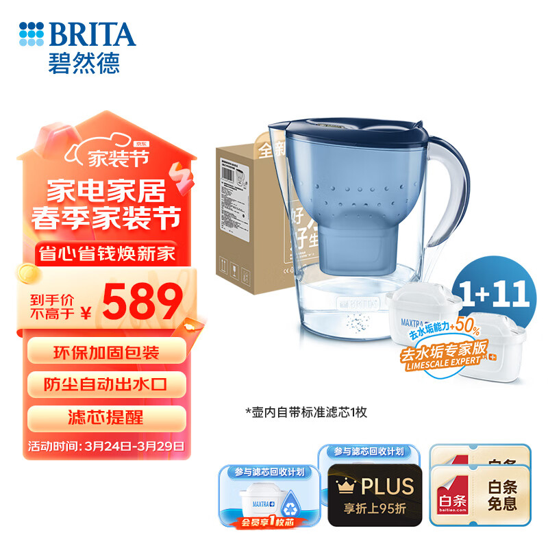碧然德(BRITA)过滤净水器 家用滤水壶 海洋系列 3.5L(蓝色)+去水垢专家版滤芯11枚 环保加固包装价格:589.00元!