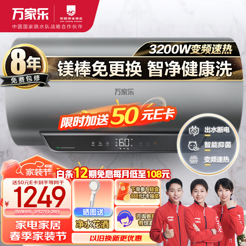 万家乐电热水器80升 储水式一级能效3200W速热 镁棒免换出水自动断电智能灭菌D80-FW5价格:1499.00元!