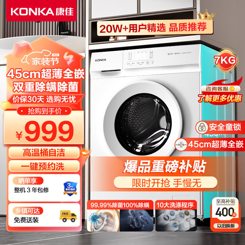 康佳(KONKA)7公斤超薄全自动滚筒洗衣机 宿舍租户小型迷你便捷 90°高温除菌 100%除螨 KG70-1005价格:999.00元!