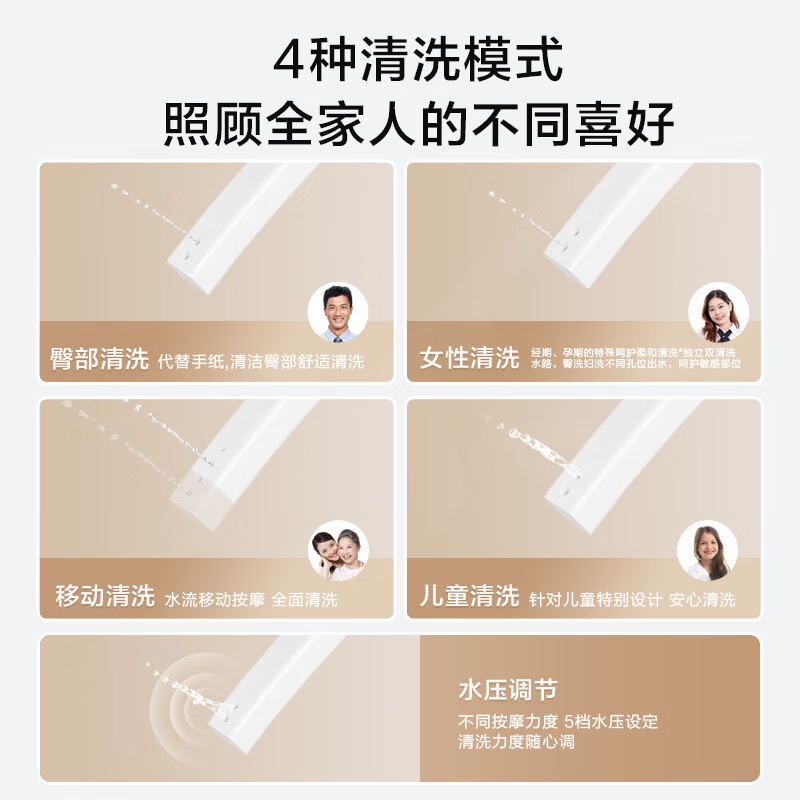 功能:抗菌,暖风烘干,自动除臭,臀部清洁,座圈感应,座圈加热,喷嘴自洁,喷嘴移动清洗,女性清洗,儿童清洗,净化水质,夜灯照明