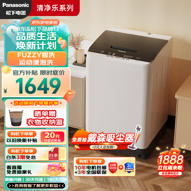 松下(Panasonic)波轮洗衣机全自动清净乐号 线纸屑 桶自洁免清洗 耐脏 10公斤大容量 以旧换新XQB100-8Q1A价格:1649.00元!