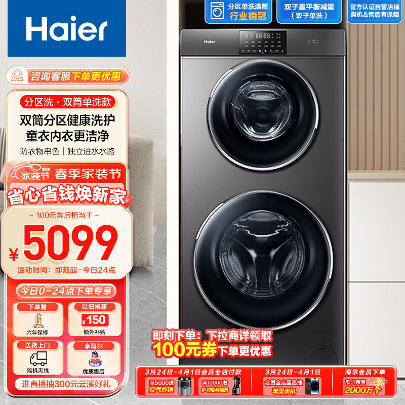 海尔(Haier)滚筒洗衣机全自动 双筒分区单洗款 4+9公斤 母婴儿童内衣 以旧换新家用大容量 XQGF130-B1258U1价格:5299.00元!