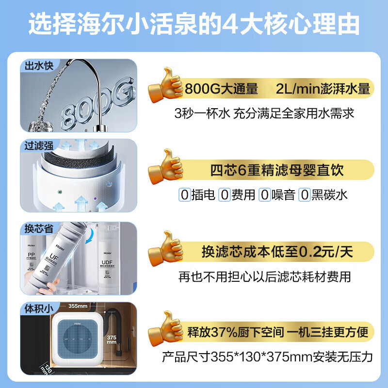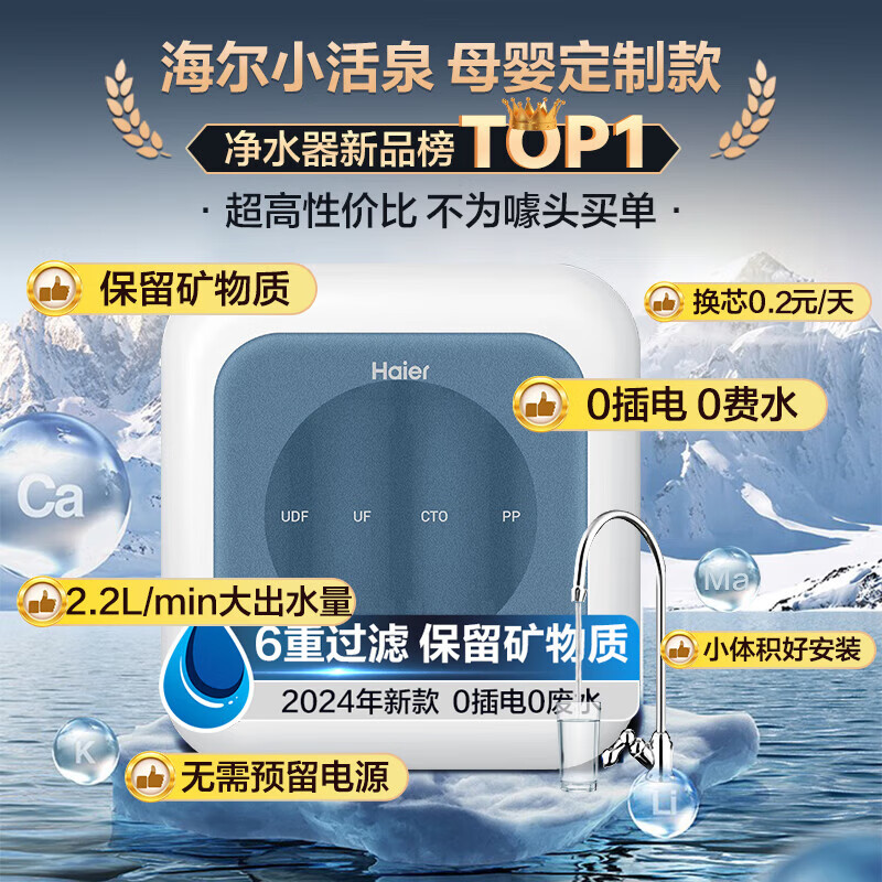 海尔(Haier)【24年新品小活泉】超滤净水器家用800G大通量自来水过滤器 矿物质不插电无废水HU603直饮净水机 小活泉净水器价格:478.00元!