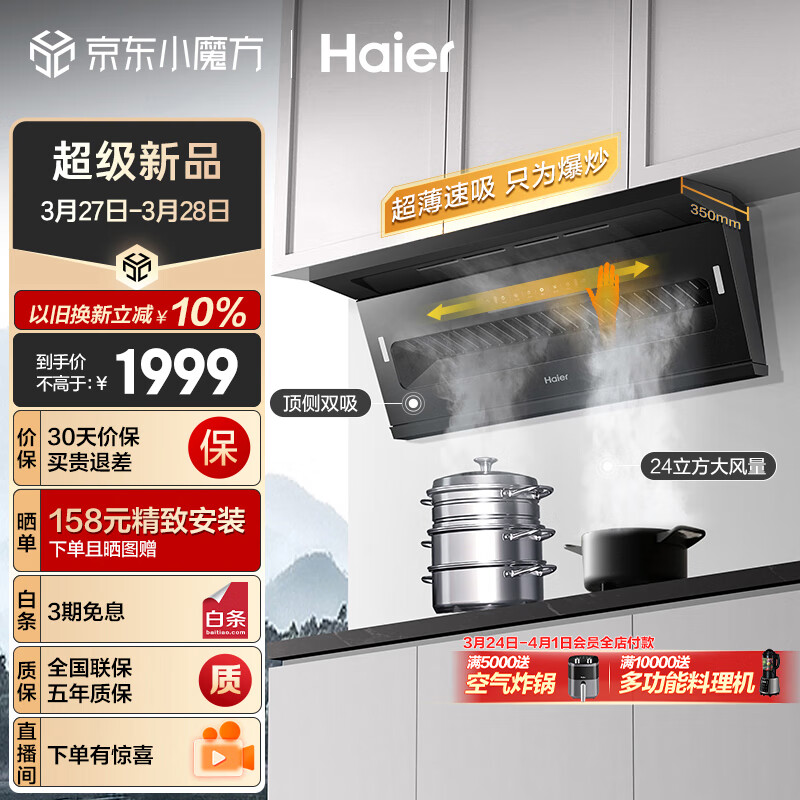 海尔(Haier)抽油烟机 顶侧双吸 7字型家用排烟机 24m3/min大吸力 齐平橱柜 挥手智控 自动清洗排吸烟机C51价格:1999.00元!