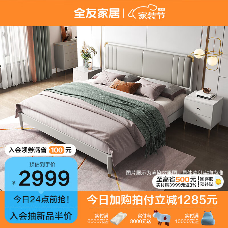 全友家居 现代轻奢卧室双人床实木框架带软包床屏框架床126901价格:4284.29元!