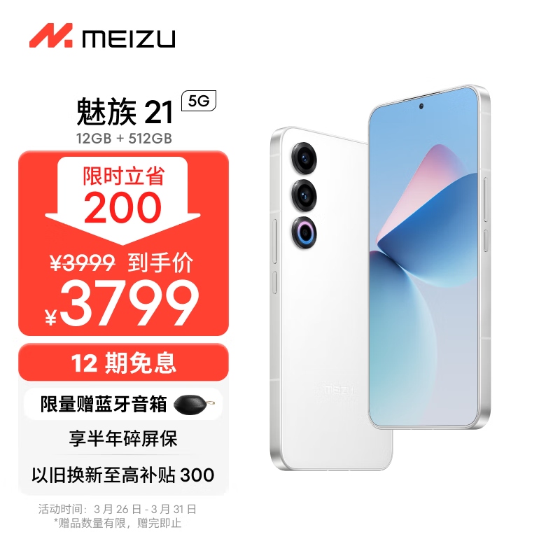 魅族(MEIZU)21 12GB+512GB 魅族白 1.74mm极窄四等边直屏 骁龙8Gen3 2亿像素 80W超充 5G游戏学生拍照手机价格:3799.00元!