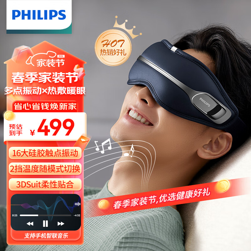 飞利浦(PHILIPS)眼部按摩仪 热敷睡眠眼罩 穴位按摩器 蓝牙护眼仪成人实用节日礼物送父母男女友3103E价格:599.00元!