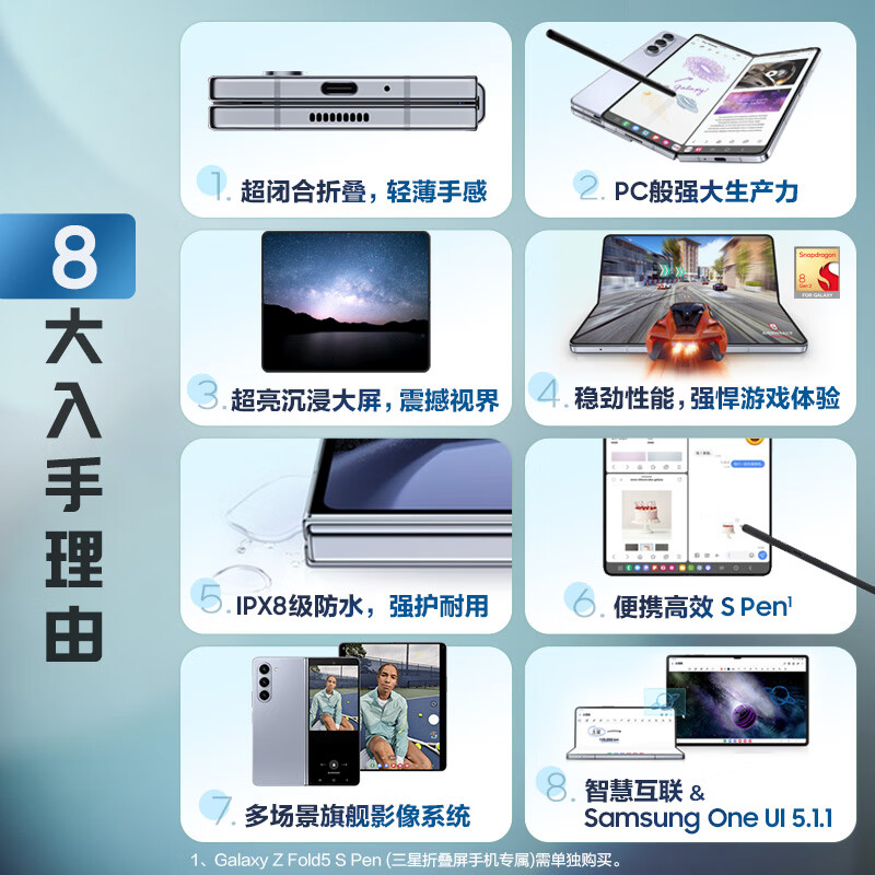 三星 SAMSUNG Galaxy Z Fold5 超闭合折叠 IPX8级防水 5G折叠手机 12GB+1TB 冰萃蓝价格:14999.00元!