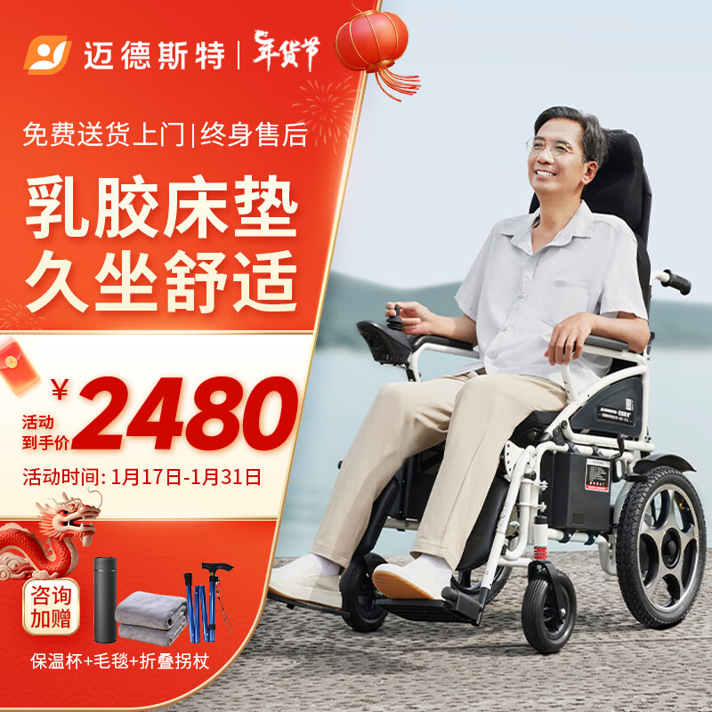迈德斯特 电动轮椅车全自动折叠轻便老人残疾人便携【自调平躺+乳胶坐垫+可选带坐便】801高靠背-12AH铅酸价格:2880.00元!