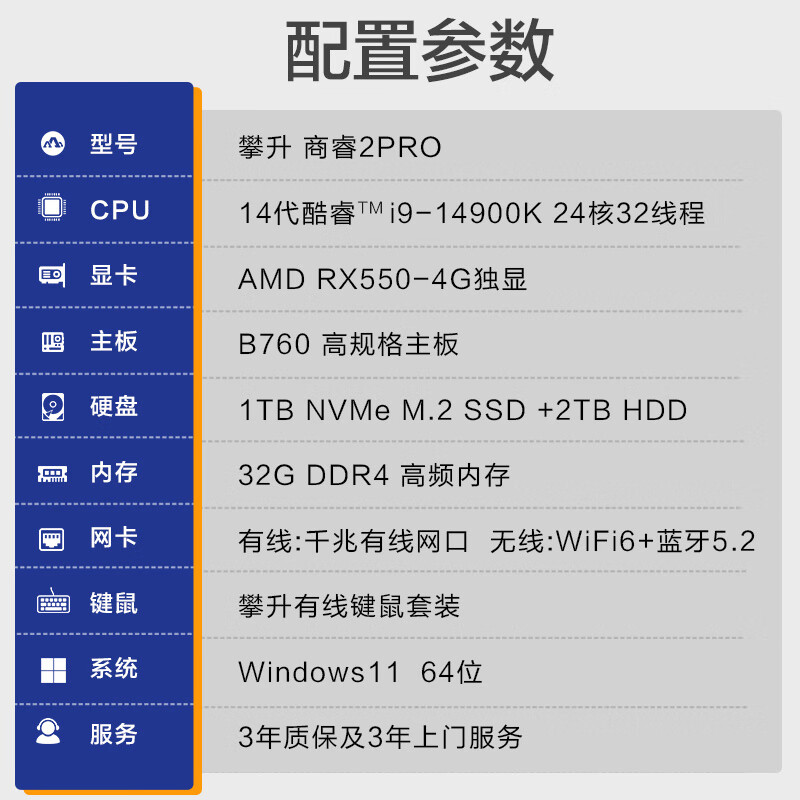 攀升 商睿2Pro 酷睿i9设计师办公商用台式电脑主机(14代i9-14900KF 32G 1TB SSD+2T 4G独显 WiFi6)价格:7999.00元!