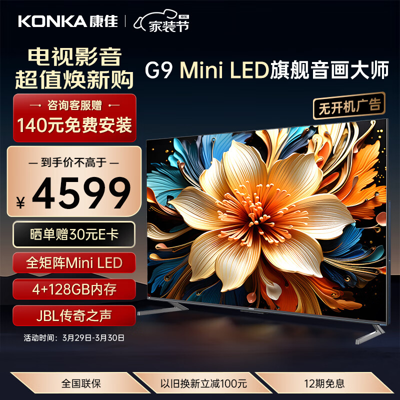 康佳电视 65G9 65英寸 Mini LED 144Hz 1200nits 4+128G 4K超清屏智能液晶平板游戏电视机以旧换新价格:4599.00元!