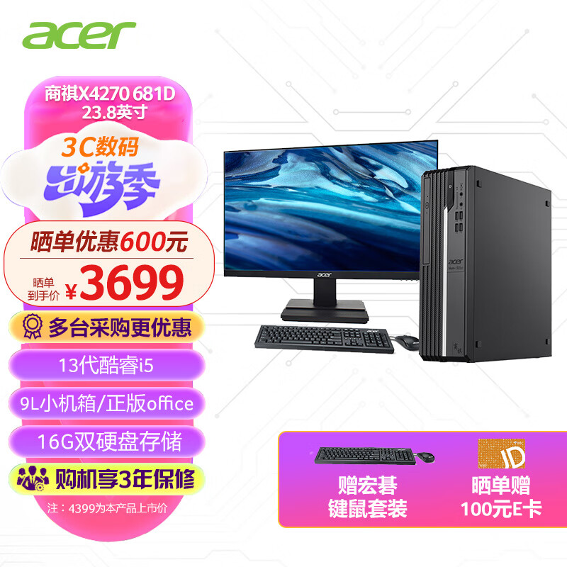 宏碁(acer)商祺X4270 681D 23款商用办公电脑台式主机 (酷睿13代i5-13400 16G 512G+1T) 23.8英寸显示器套机价格:3799.00元!